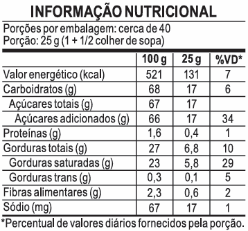 Açúcar, gordura vegetal, cacau em pó, soro de leite em pó, sal, emulsificantes lecitina de soja* e polirricinoleato de poliglicerol, acidulante ácido cítrico e aromatizante. *Geneticamente modificada a partir do Agrobacterium tumefaciens, Streptomyces viridochromogenes, Arabbidopsis Thaliana, Bacillus Thuringiensis.
