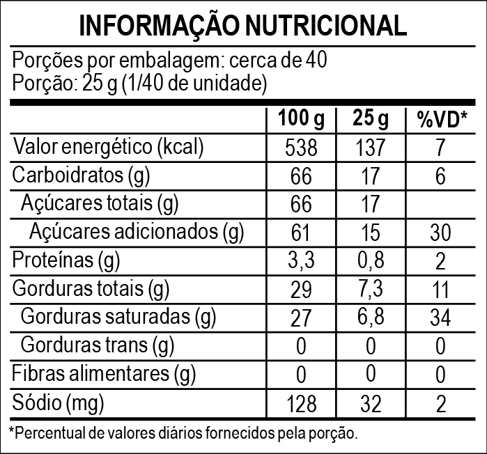 CONTÉM DERIVADOS DE LEITE E SOJA. PODE CONTER AMENDOIM, AVELÃS, CASTANHA-DE-CAJU, AMÊNDOA, CASTANHA-DO-PARÁ, MACADÂMIAS, NOZES, PECÃS, PISTACHES, PINOLI, CASTANHAS, TRIGO, CENTEIO, CEVADA E AVEIA. CONTÉM LACTOSE. CONTÉM GLÚTEN.