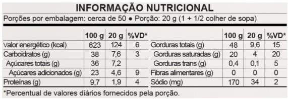 Gordura vegetal, leite em pó integral, açúcar, pasta de avelã, biscoito wafer (farinha de trigo enriquecida com ferro e ácido fólico, óleo de soja, sal, emulsificante lecitina de soja e fermento químico bicarbonato de sódio), cacau em pó, sal, emulsificantes lecitina de soja, poliglicerol, polirricinoleato e mono e diglicerídeos de ácidos graxos e aromatizantes. Geneticamente modificado a partir de Agrobacterium tumefaciens, Streptomyces viridochromogenes, Arabidopsis thaliana, Bacillus thuringiensis, Agrobacterium sp.