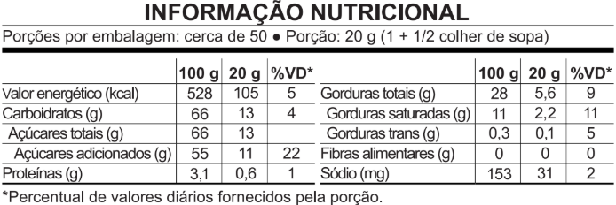 Açúcar, gordura vegetal, soro de leite em pó, leite em pó desnatado, sal, emulsificantes lecitina de soja* e polirricinoleato de poliglicerol, aromatizantes, acidulante ácido cítrico e corante vermelho allura AC. *Geneticamente modificada á partir do Agrobacterium tumefaciens, Streptomyces viridochromogenes, Arabbidopsis Thaliana, Bacillus Thuringiensis.