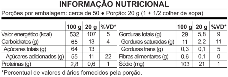 Açúcar, gordura vegetal, soro de leite em pó, leite integral em pó, cacau em pó, canela em pó, emulsificante lecitina de soja e aromatizantes. *Geneticamente modificada a partir do Agrobacterium tumefaciens, Streptomyces viridochromagenes, Arabidopsis thaliana, Bacillus thuringiensis.